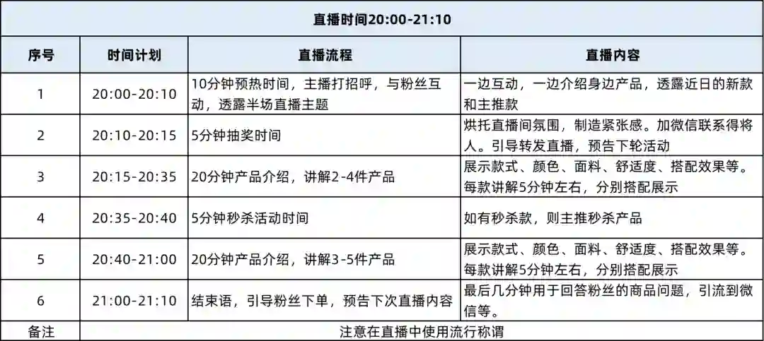 以晚上8点到9点一个小时的服装直播流程安排为例: