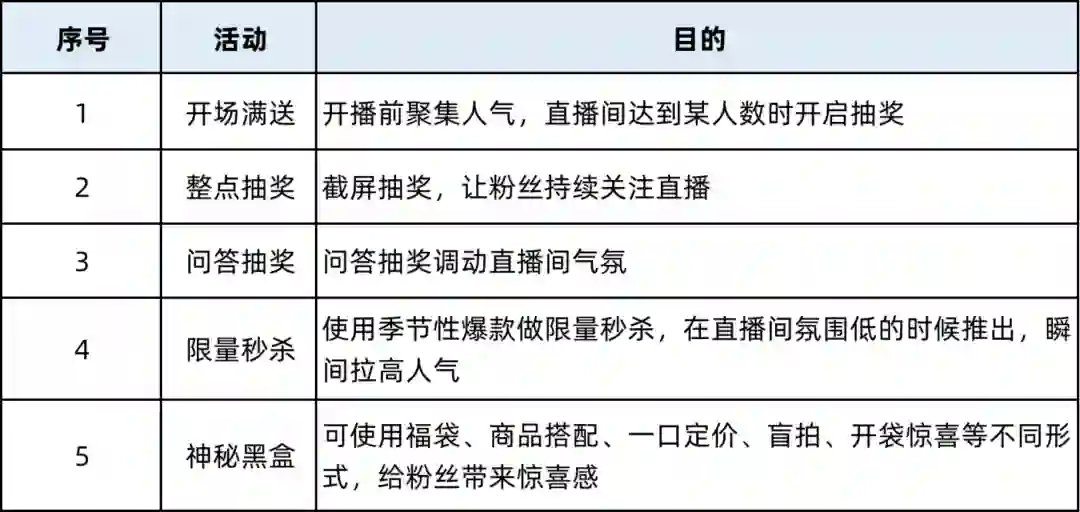 可以看到,一场直播主要分为预热、抽奖、产品介绍、引导下单、下期预告这几个环节。