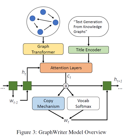 End2End 文本生成整体上还是由编码和解码两个部分构成(如下图),其中,编码结果由两个编码输入整合得到,分别为图谱编码(来自 graph transformer)与主题/标题(Title)编码(来自biRNN)。个人理解,主题编码的目的是给多句文本的生成提供一个顺序指导,假设多句连贯文本本质上是一条一套三元组构成的路径,主题编码则是表示路径的起点,以及生成过程必须经过的某些节点。
