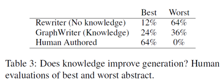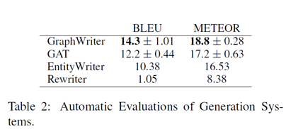 作者考虑了人工评价与自动评价两种评测机制,自动评价方法选择了常见的BLEU与METEOR,用于反映生成文本相对参考文本的n元文法相似程度,对比系统与结果如下表所示。