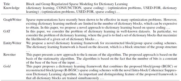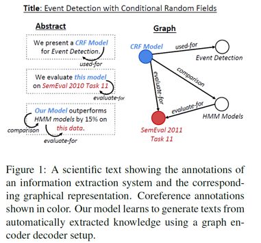 本文实验所使用的训练数据来自AGENDA(Abstract Generation Dataset,摘要生成数据集,科技论文领域),作者利用SciIE信息抽取系统,将摘要中的实体/关系识别出来,作为节点构建知识图谱,过程如下图所示。