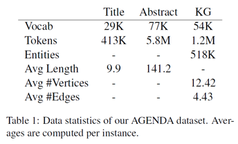 AGENDA数据集的相关统计参数如下图所示,作者将数据集切分为38720规模的训练集,1000验证集与1000测试集