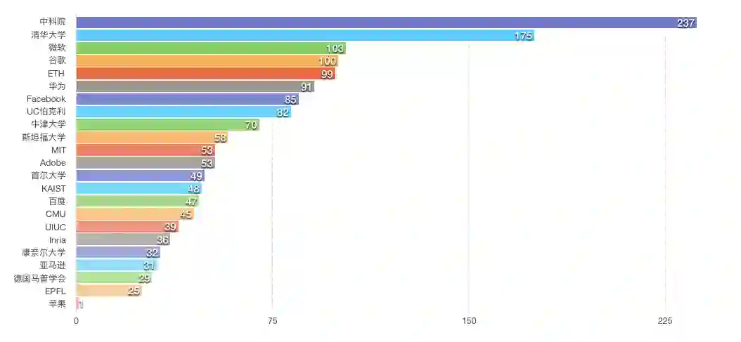 在投稿阶段,ICCV 2019 官方推特列出了部分投稿单位排名。其中,中科院、清华、华为、百度等高校个企业名列前茅。中科院和清华更是以 237 和 175 篇的论文投稿数量遥遥领先。