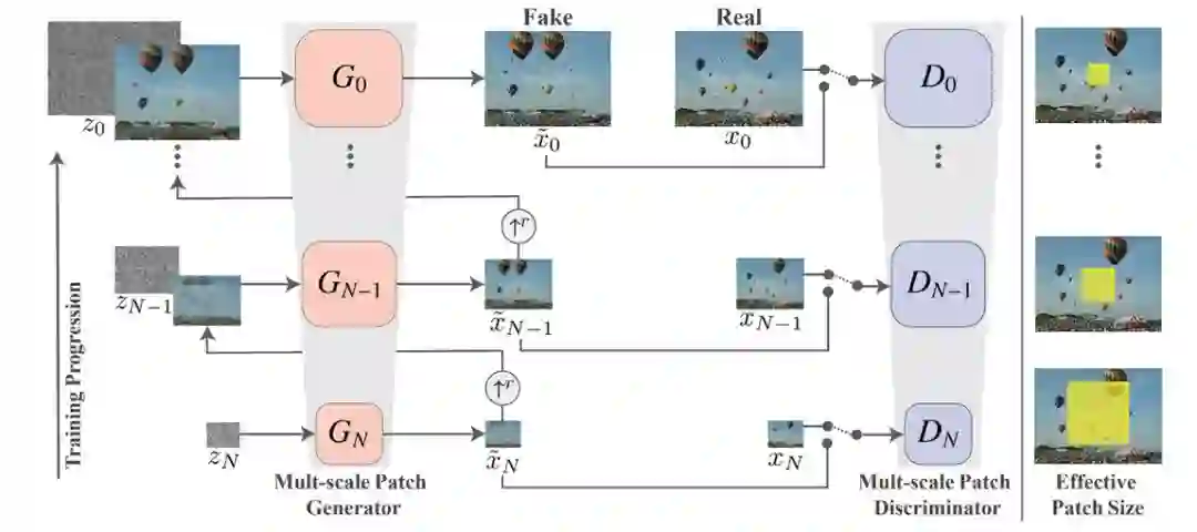 图 4:SinGAN 的多尺度生成流程,模型由 GAN 的一种金字塔方案组成,每一层都是一个生成对抗网络,它们从下到上学习着不同尺度的图像生成效果。SinGAN 的训练和推断过程都是从粗粒度到细粒度的方向进行。
