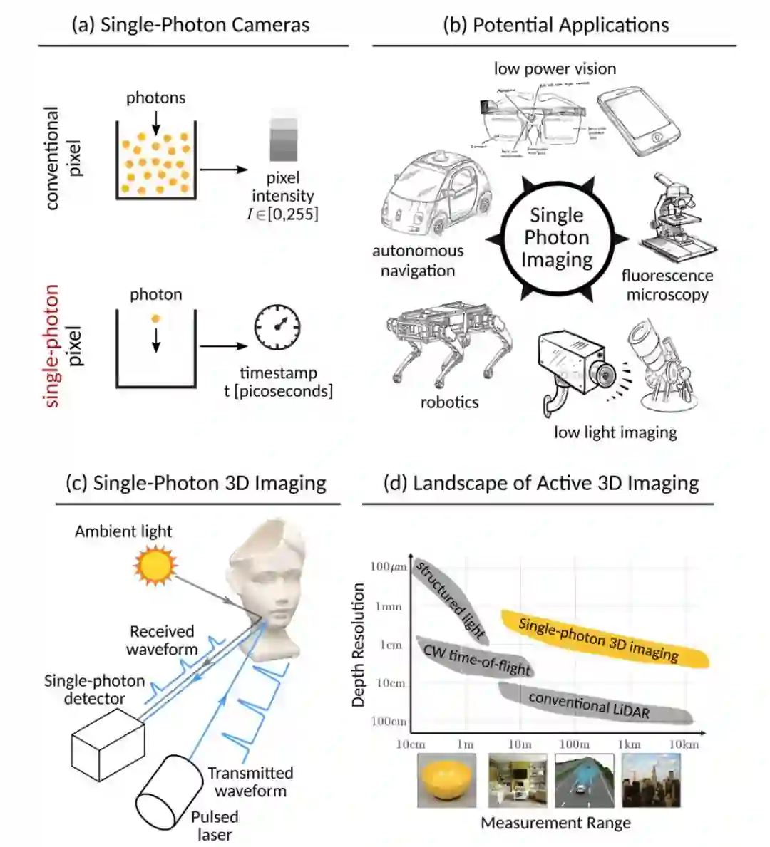 图 1:单光子摄像头和 3D 成像示意。(a)一个单光子摄像头像素对于单个光子敏感,可以在捕捉光子达到的时间并在皮秒内进行处理。(b)高敏感性和分辨率使得单光子摄像头在很多应用上有实际价值。(c)一个基于飞行时间的单光子三维摄像头由两部分组成:一个脉冲式激光和一个单光子检测器,可以给返回的光子计时。(d)单光子摄像头能够提供非常高的深度分辨率,即使距离很长。