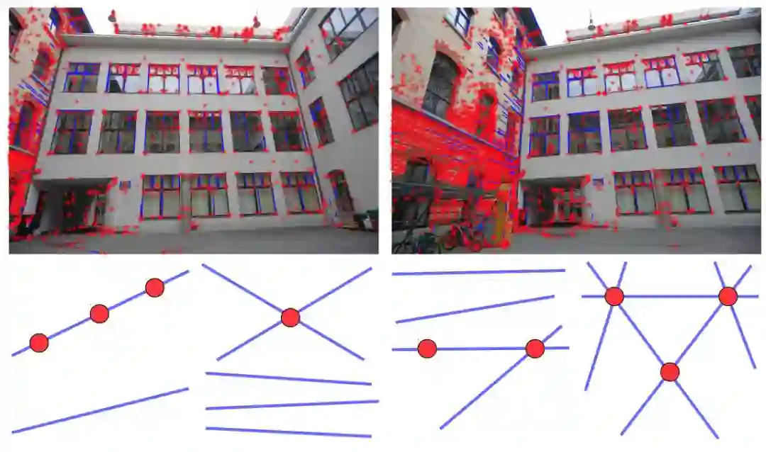 图 1:第一行红色的点和蓝色的线会独立地被检测到,且点与线的排列也是独立检测的。第二行展示了一些点线排列示例,它们提供了新的极小值问题。