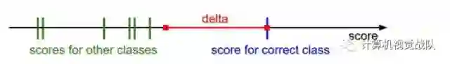 多类SVM“想要”正确类别的分类分数比其他不正确分类类别的分数要高,而且至少高出delta的边界值。如果其他分类分数进入了红色的区域,甚至更高,那么就开始计算损失。如果没有这些情况,损失值为0。我们的目标是找到一些权重,它们既能够让训练集中的数据样例满足这些限制,也能让总的损失值尽可能地低。