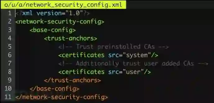 android.security.net.config包实现了网络安全配置模块,而主类ManifestConfigSource加载XML文件中指定的自定义配置或默认配置时(在资源文件不存在的情况下)。 你可以看到下面的内容: