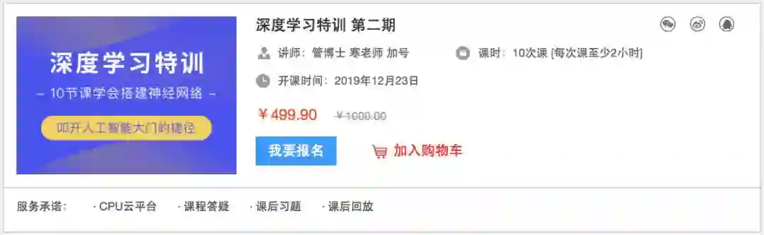 售价499.9元的【深度学习特训】课程 ,我给大家争取了30个优惠学习的名额!而且不需要发朋友圈之类的,仅需9.9元就可以学习。