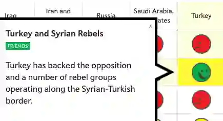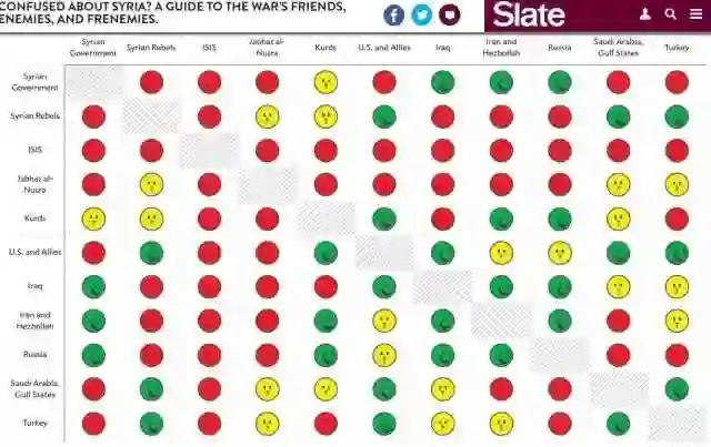 许多不同的团体之间的关系可能很难理解 – 尤其是当有11个这样的团体存在的时候,这些团体之间有的结盟,有的敌对,反之亦然。这让人难以理解。但是,Slate网站通过表格的形式和熟悉的视觉效果和色彩,将这些数据简化为一种简单的、易于理解和互动的形式。