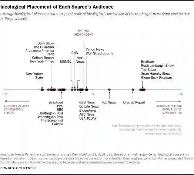 据Pew研究中心称,通常,当设计师在信息内容很多又不能删节的时候,他们通常会把信息放到数据表中,以使其更紧凑。但是,他们使用分布图来代替。为什么呢?因为分布图可以让观众在频谱上看到每个媒体的渠道。在分布图上,每个媒体的渠道之间的距离尤为显著。如果这些点仅仅是在表中列出,观众无法看到每个渠道之间的比较。