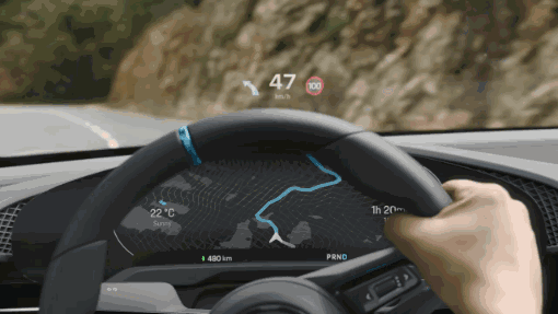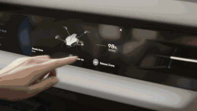 显示屏启动,自动起飞,智能围绕行驶路线,将周围的地形、车流等,实时传到车内。