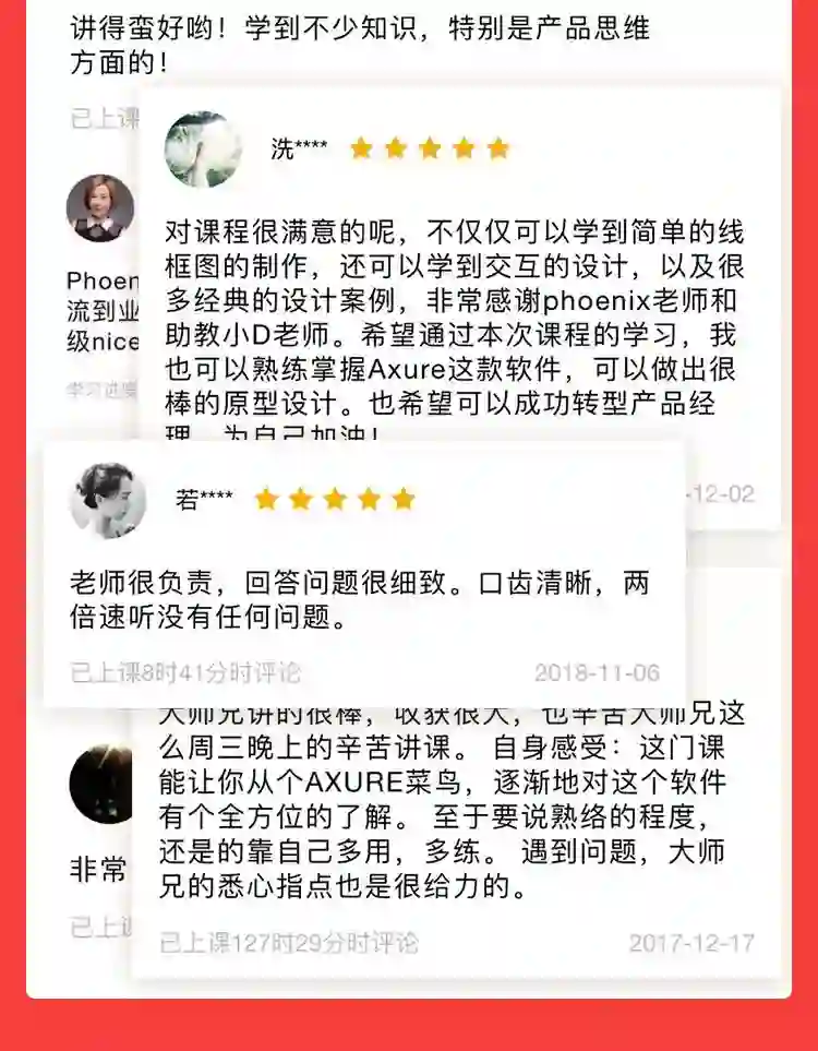 6周Axure实战班通过4500+学员验证和反馈,迭代了多次,课程通俗易懂。坐公交、地铁或者吃饭的时候都能听,充分利用碎片时间。