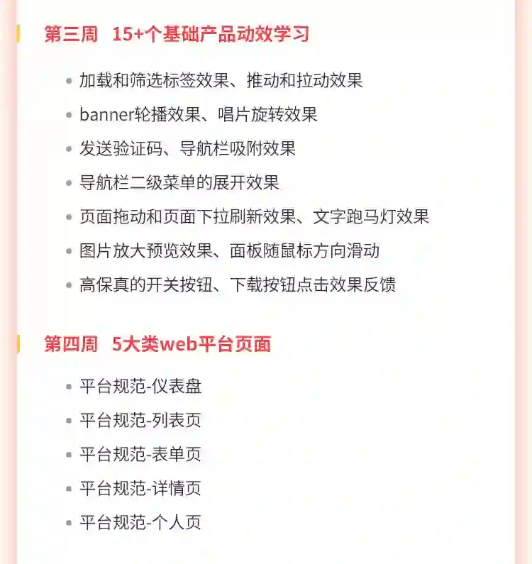 在前2周功能基础掌握的情况下,你会系统学习到web端、手机端的产品交互动效,进阶学习切换、拖动、平滑等15+个进阶效果
