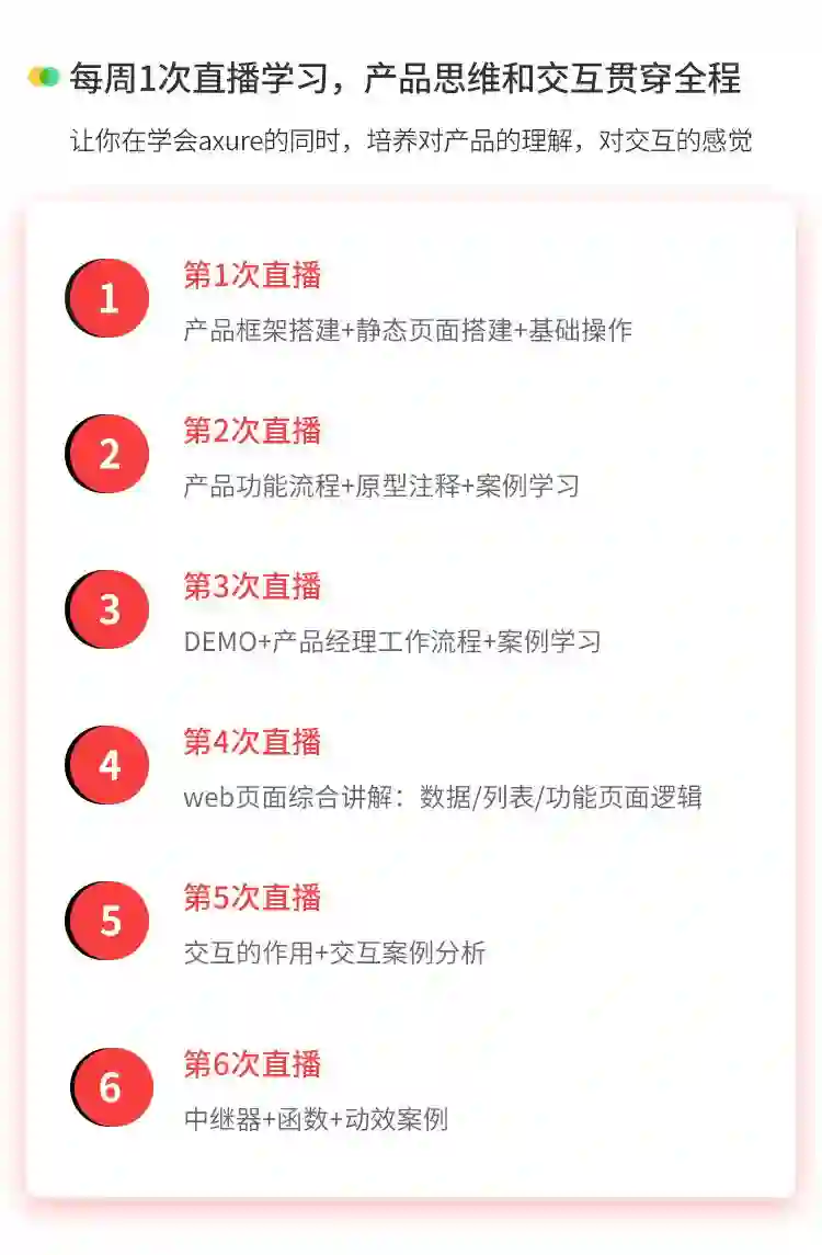 Axure实战班安排了6次直播课,老师会在直播课上讲解更多的交互和产品设计。让你在学Axure的同时,培养对产品的理解,对交互的感觉