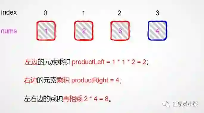 所以除下标为 2 以外的元素的积为左侧乘积 * 右侧乘积。