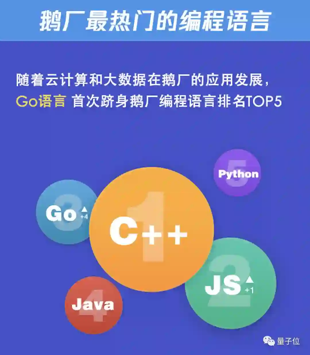 他们使用最多的语言是C++,其次是JavaScript。腾讯表示,随着云计算和大数据在鹅厂的应用发展,Go语言首次跻身鹅厂编程语言排名TOP5,这次排名第三,然后是Java、Python位列4、5名。