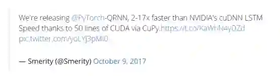 Salesforce Research发布了多个软件包,其中包括PyTorch-QRNN,这是一种RNN,比由CuDNN优化的标准LSTM快2到17倍。 詹姆斯·布拉德伯里(James Bradbury)和团队是PyTorch社区中最活跃和最有魅力的部队之一。
