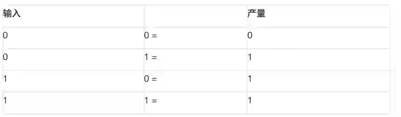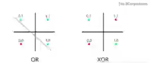 在OR逻辑中,可以将真实组合与虚假组合分开。但是从上图你可以看到,你不能将XOR逻辑与一个线性函数进行分割。