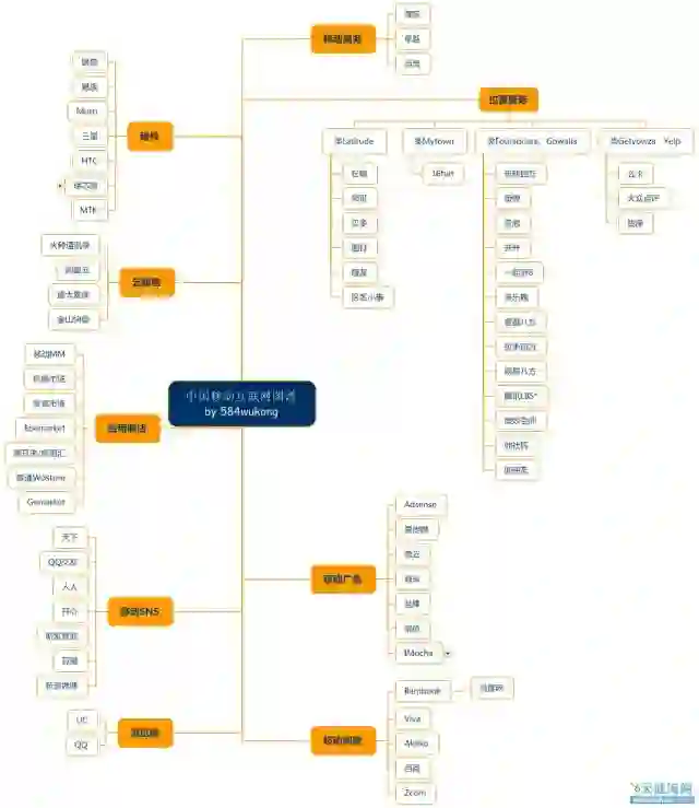 (这张图是早年在移动广告聚合平台果合工作,现在是触控 COO 的好朋友悟空,在当时很棒的个人科技博客---天涯海阁上发布的移动互联网图谱。今天回头看这样一张图可能大家会觉得有些搞笑,但那时候市面上听过名字的项目也就是这些了。)