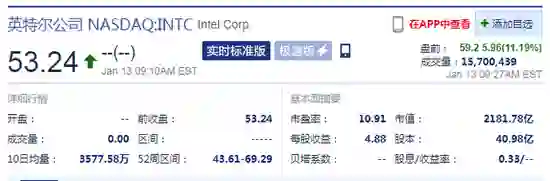 截止发稿前,英特尔盘前涨超11%报59.2美元: