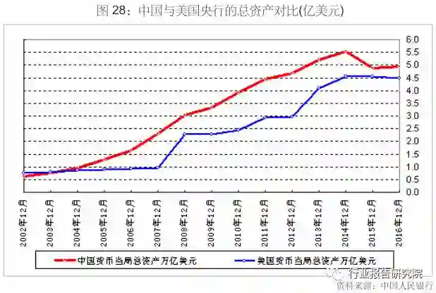 2016年,中国国内生产总值(GDP)现价换算成为美元约为10.73亿美元,美国国内生产总值(GDP)现价为18.57亿美元,前者是后者的57.8%。同年,中国央行的总资产换算成为美元约为4.96亿美元,美国央行的总资产为4.50亿美元,前者是后者的1.1倍。