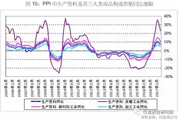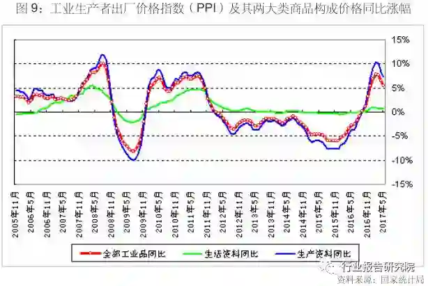 从2016年第一季度开始,工业生产者出厂价格指数(PPI)出现明显上涨趋势,在 2017年第一季度达到顶峰,从第二季度开始转入下跌走势。