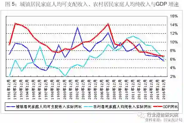 从比较长时间看,居民收入增速低于国内生产总值增速。中国贫富两级分化,平均数并不能反映广大民众的真实收入情况。近几年,国内生产总值增速下行,居民收入增速也跟随下行,而且下行速度更快。