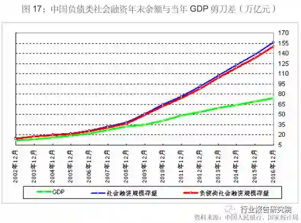 长期以来,尤其是2008年以后,中国负债类社会融资年末余额同比增速大于当年国内生产总值(GDP)同比增速,导致负债类社会融资年末余额与当年GDP剪刀差越拉越大,经济杠杆率越来越高。