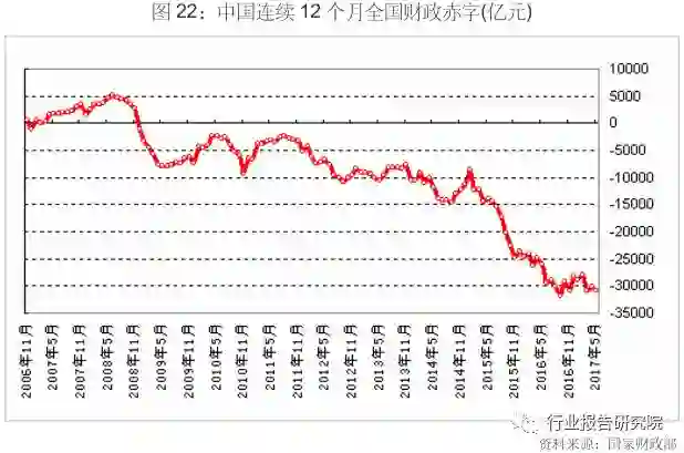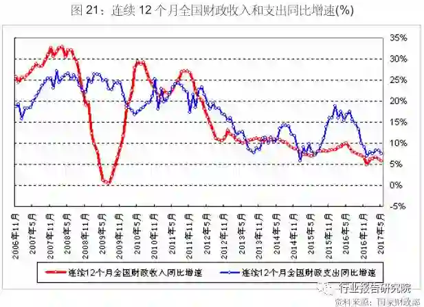 从2015年下半年开始到2016年上半年,连续12个月全国财政支出增速明显大于收入增速,说明积极财政政策力度加大。2016年下半年以后,连续12个月全国财政支出增速快速下降,到2017年上半年降低到略微大于财政收入增速,说明积极财政政策力度降低。