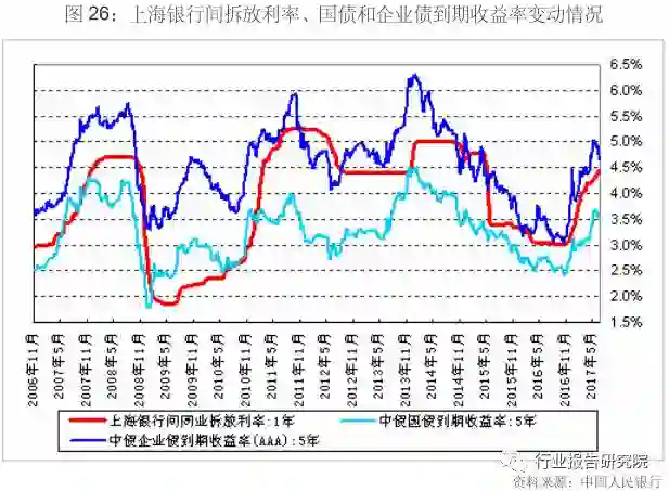 从2016年第四季度到2017年6月下旬,5年期AAA级企业债到期收益率上升了约2个百分点,1年期上海银行间拆放利率上升了约1.5 个百分点,5年期国债到期收益率上升了约1个百分点。市场利率快速较大幅度上涨,既是对货币政策转向稳健中性的反应,也是对经济高杠杆高泡沫风险的反应。