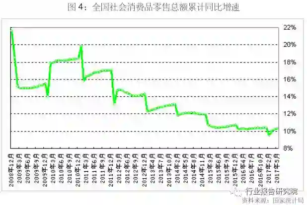 2017年下半年,国内生产总值(GDP) 同比增速预计下行,居民收入增速预计也将下行,全国社会消费品零售总额累计同比增速下行压力大,预计勉强稳定在10%附近。