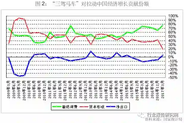 近两年来,最终消费支出对拉动中国经济增长贡献份额总体呈现稳步上升趋势,资本形成贡献份额总体呈现震荡下跌趋势,净出口贡献份额在0%附近震荡,2017年下半年,“三驾马车”对拉动中国经济增长贡献份额预计延续该趋势。
