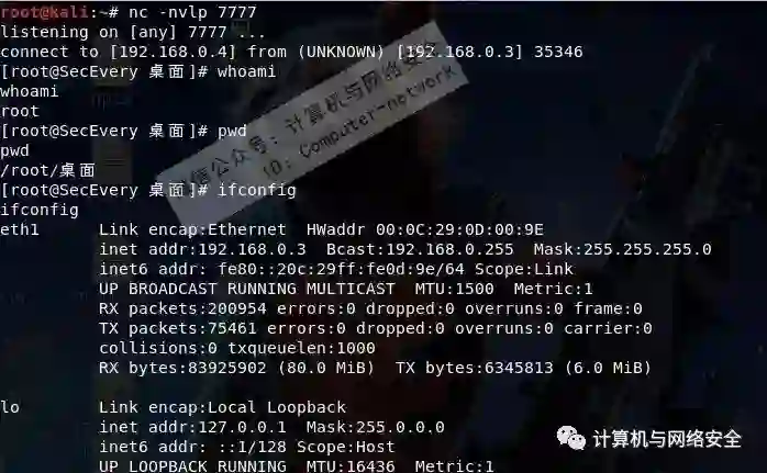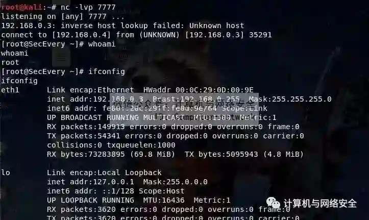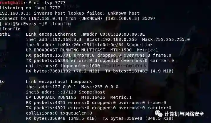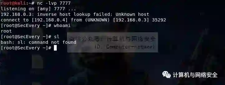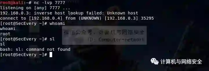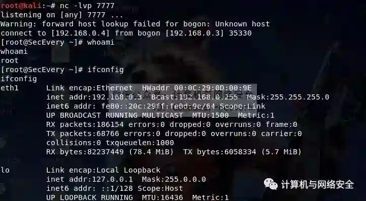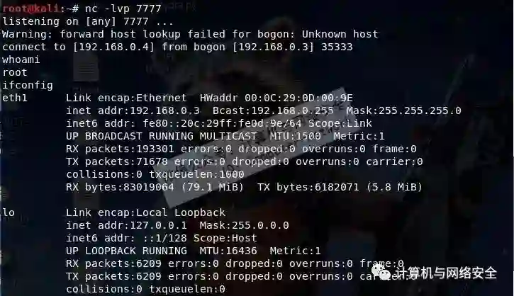 注意之前使用nc监听端口反弹shell时都会有一个警告:Warning: forward host lookup failed for bogon: Unknown host,根据nc帮助文档的提示加上-n参数就可以不产生这个警告了,-n参数代表在建立连接之前不对主机进行dns解析。