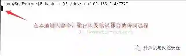 下面在该命令后面加上0>&1,代表将标准输入重定向到标准输出,这里的标准输出已经重定向到了/dev/tcp/ip/port这个文件,也就是远程,那么标准输入也就重定向到了远程,这样的话就可以直接在远程输入了: