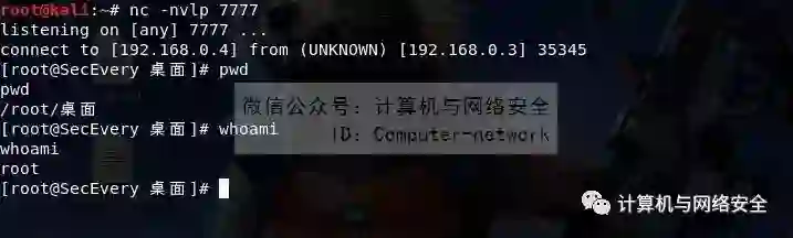 这里的-e后面跟的参数代表的是在创建连接后执行的程序,这里代表在连接到远程后可以在远程执行一个本地shell(/bin/bash),也就是反弹一个shell给远程,可以看到远程已经成功反弹到了shell,并且可以执行命令。