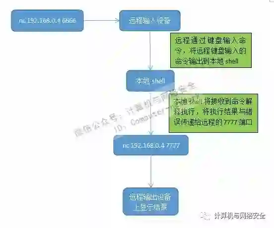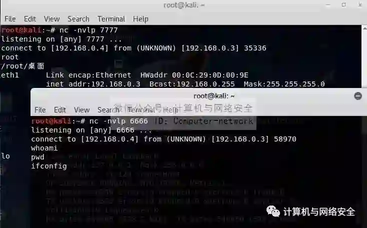 这里通过在kali上监听两个端口,然后在使用CentOS进行反向连接的时候使用到了管道符,管道符的作用是把管道符前的输出作为管道符后的输入,这样的话就可以在远程的6666端口的输入设备(键盘)输入命令,将命令输出传递至本地的/bin/bash,通过本地shell解释执行命令后,将命令执行的结果以及错误输入到远程的7777端口。