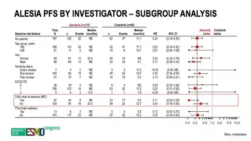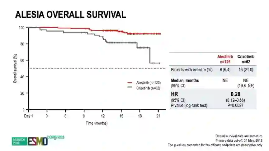 目前OS数据尚未成熟,达到死亡终点的事件率,克唑替尼组和阿来替尼组分别为21%和6.4%。两组的mOS均尚未达到,从初步的研究结果来看,阿来替尼显著降低患者死亡风险,HR 0.28(95%CI:0.12-0.68),P=0.0027。