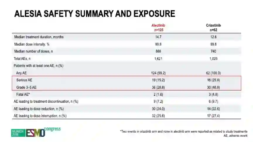 总体人群中,接受克唑替尼和阿来替尼治疗的中位时长分别为12.6和14.7个月。两组患者中,SAE的发生率分别为25.8%和15.2%;3-5度AE发生率分别为48.8%和28.8%。因AE导致治疗中止的患者比例,两组分别为9.7%和7.2%;因AE导致剂量减量的患者比例,两组分别为22.6%和24%。