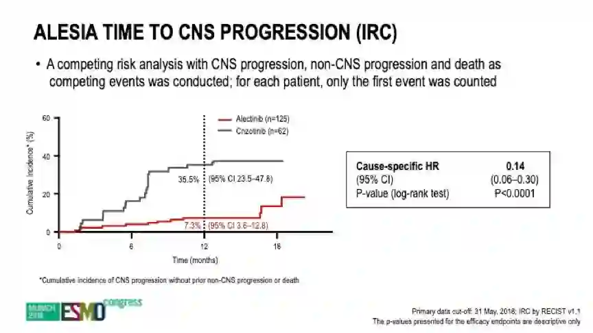 进展部位竞争风险分析展示,阿来替尼可以显著延缓至CNS进展风险,HR为0.14(95%CI:0.06-0.30);12个月的CNS进展累积发生率,克唑替尼和阿来替尼组分别为35.5%和7.3%。