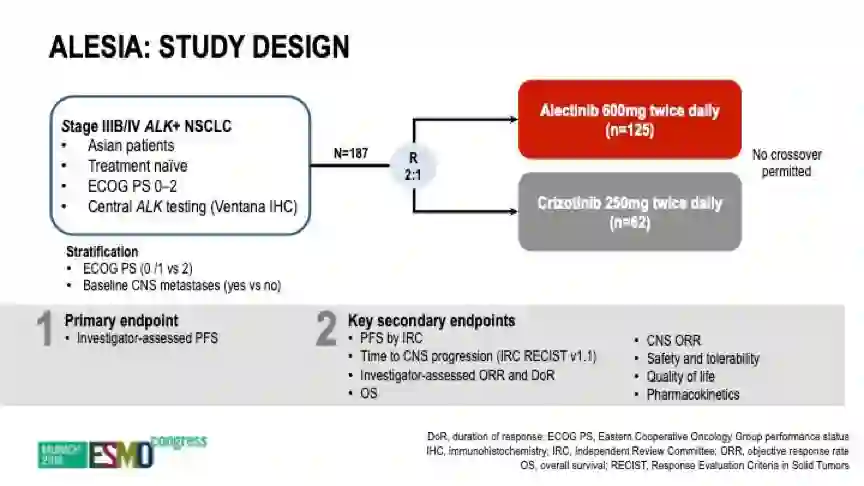 ALESIA研究入组了初治晚期或转移性ALK+ NSCLC,ALK检测在中心实验室进行,采用Ventana IHC法检测,要求患者ECOG PS评分0-2分。入组患者2:1随机分配接受阿来替尼600mg,bid或克唑替尼250mg,bid治疗,根据研究方案,两组患者进展后不交叉。分层因素包括ECOG PS评分(0-1 vs 2分)、基线CNS转移状态(有 vs 无)。主要研究终点为研究者评估的PFS,次要终点包括独立评估委员会评估(IRC评估)的PFS、至CNS进展时间(IRC评估)、研究者评估的ORR、DOR、OS、安全性和耐受性以及药代动力学。