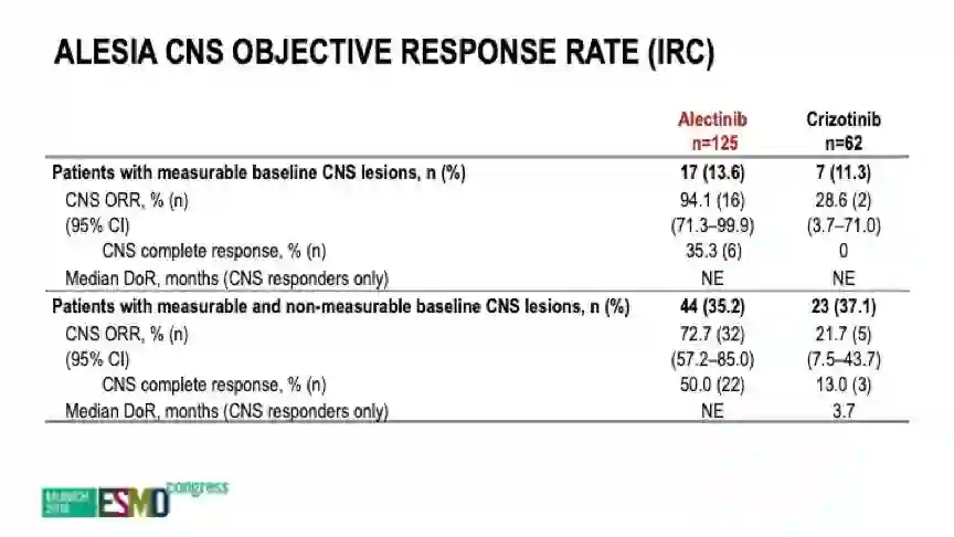 研究者评估的客观缓解率(ORR)比较,克唑替尼组和阿来替尼组分别为77.4%和91.2%。中位缓解持续时间对比,克唑替尼组和阿来替尼组分别位9.3和NE,HR 0.22 (0.12–0.40); P<0.0001。基线合并可测量或不可测量颅内病灶的患者,克唑替尼组和阿来替尼组分别为23例(37.1%)和44例(25.2%);IRC评估的CNS ORR,两组分别为21.7%和72.7%,中位DOR分别为3.7个月和尚未达到。基线合并可测量CNS病灶的患者,克唑替尼组和阿来替尼组分别为7例和17例。CNS ORR两组分别为28.6%和94.1%。