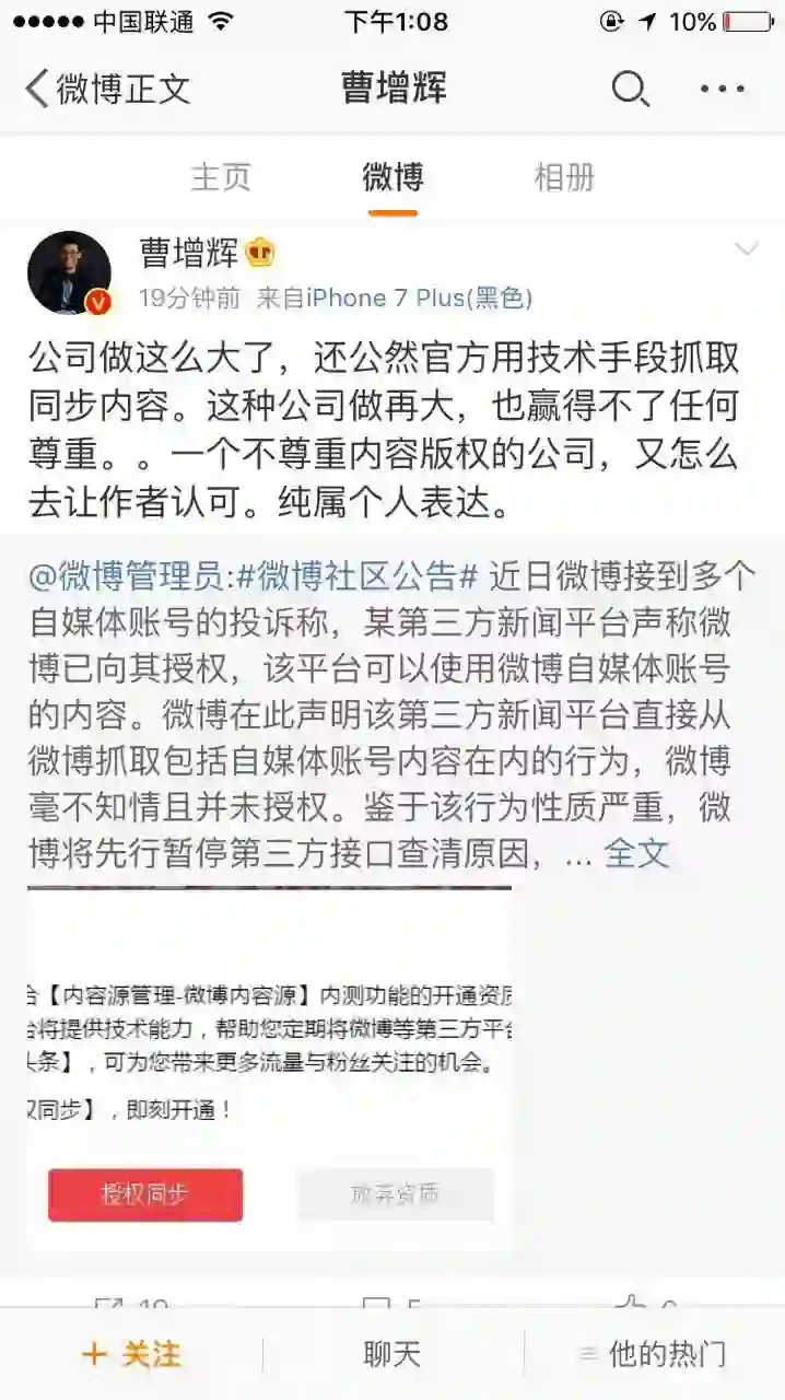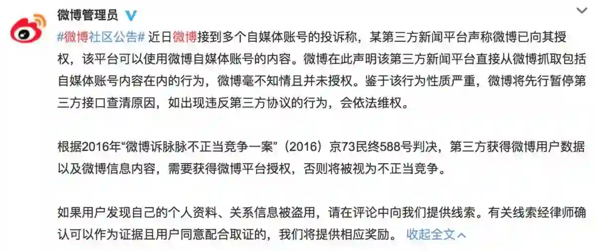 今天中午十二点,微博官方公布了一则社区公告,称某第三方新闻平台在微博毫不知情、并未授权的情况下直接从微博抓取自媒体账号的内容,鉴于其行为性质严重,微博先行暂停了第三方接口,并表示将会依法维权。