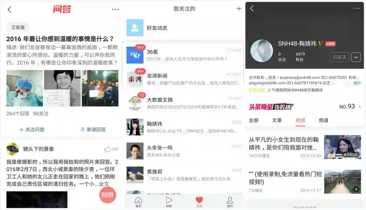 从去年开始,今日头条官方就开始邀请一大批偶像明星进驻头条号平台,而头条问答功能的推出,也加快了今日头条的加 V 认证体系推出的进程,这种通过强运营的手段把明星、大 V 拉来平台的手段和当年微博的打法如出一辙。