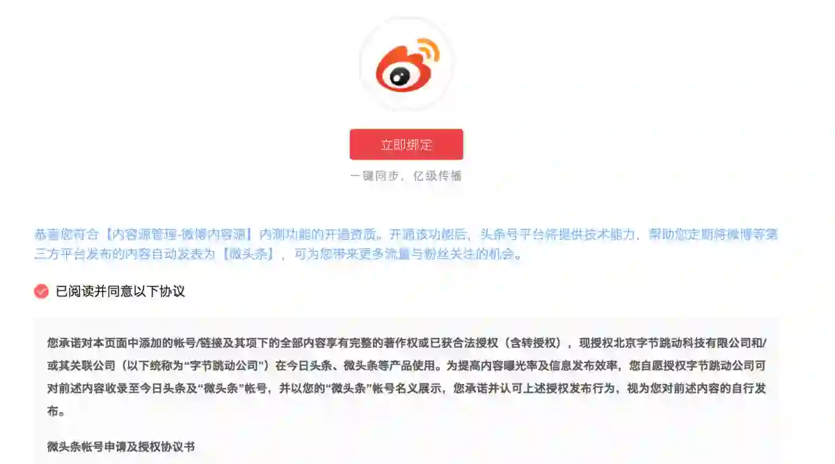 头条号作者只需点击授权同步页面就将直接进入绑定环节,如果之前这个账户绑定过微博,那么整个过程甚至不需要你再去登录微博账号寻找授权。