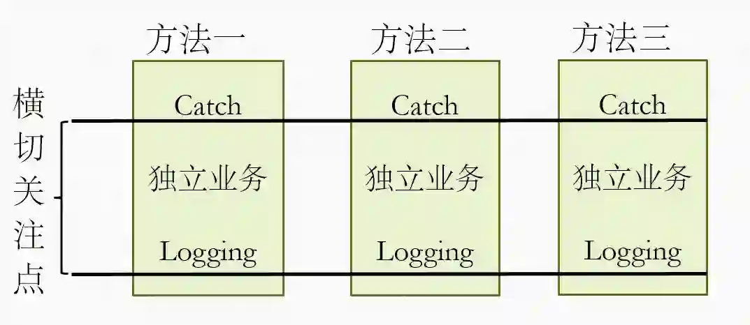 横切关注点:存在于项目的绝大多数业务中可以通用的一些辅助性的功能。例如日志、安全、持久化等模块。它们存在于核心业务代码块的各个地方,却又独立于这些核心业务逻辑。