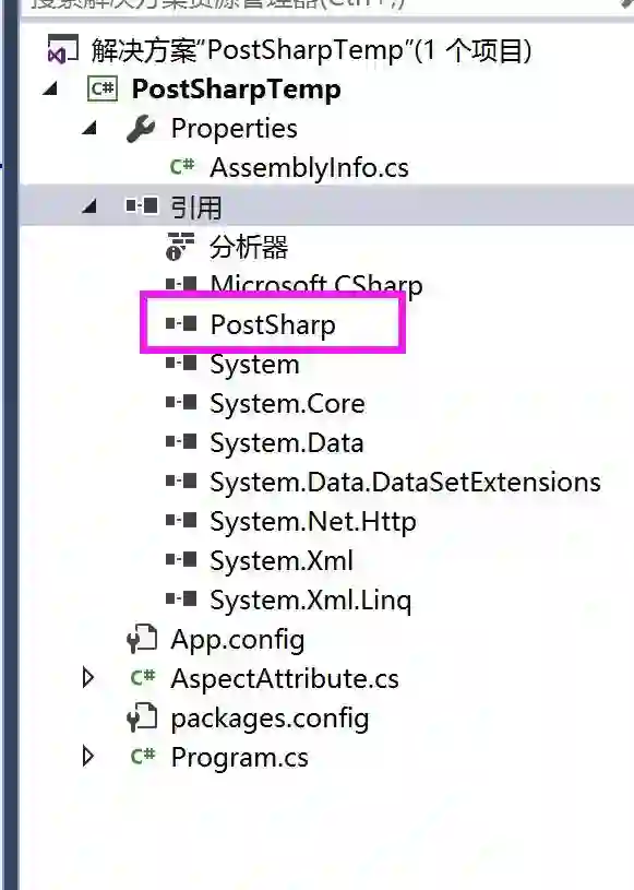 2、打开VisualStudio,新建解决方案,添加命令行项目。项目上右键后点击“Add PostSharp to project”后在弹出窗口按提示操作,会发现已经多了postsharp的引用。