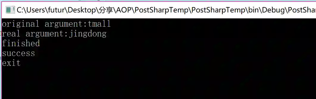 5、由此就简单通过postsharp实现了对方法的拦截,修改输入参数,监听方法成功执行以及退出。看下执行结果,成功的篡改了输入参数,并且可以看出拦截方法的方法体是先于OnSuccess执行的,OnSuccess的拦截执行完成之后才是OnExit。