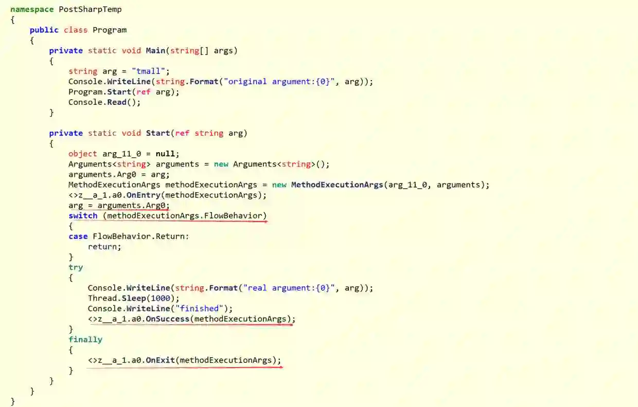 } //方法离开时 public override void OnExit(MethodExecutionArgs args)